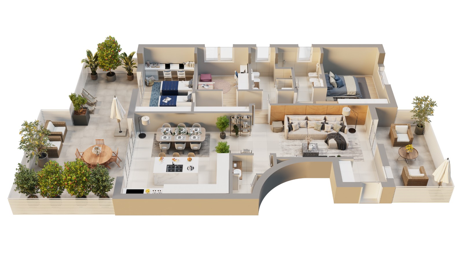La zona living si presenta come un ampio open space, caratterizzato da grandi vetrate che si affacciano sui terrazzi. La loro estensione permette di ricavare sia una zona relax che un’area pranzo. Completa l’ambiente un bagno di servizio per gli ospiti.