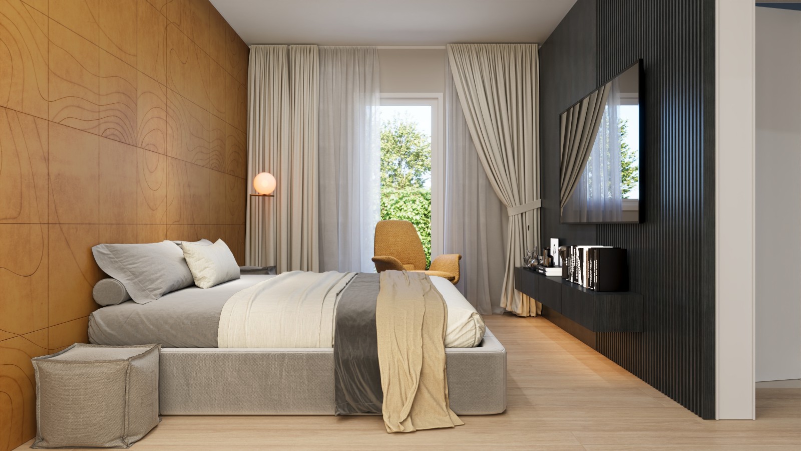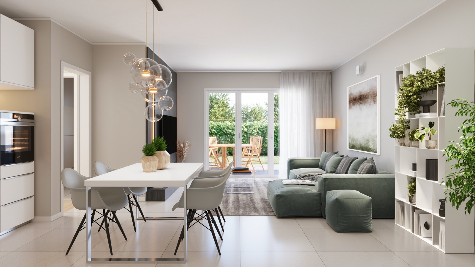 Gli ambienti interni dell’appartamento sono ampi e luminosi, studiati per garantire il massimo comfort abitativo. La zona giorno, concepita come open space, è pensata per essere vissuta appieno e si prolunga armoniosamente con il giardino, creando una continuità tra interno ed esterno.