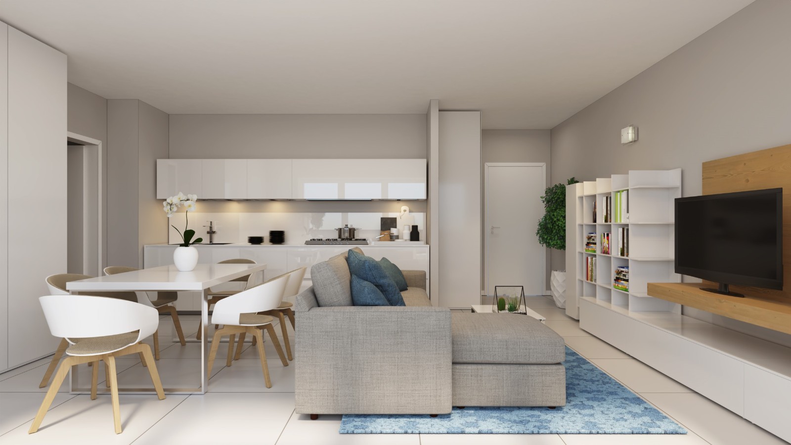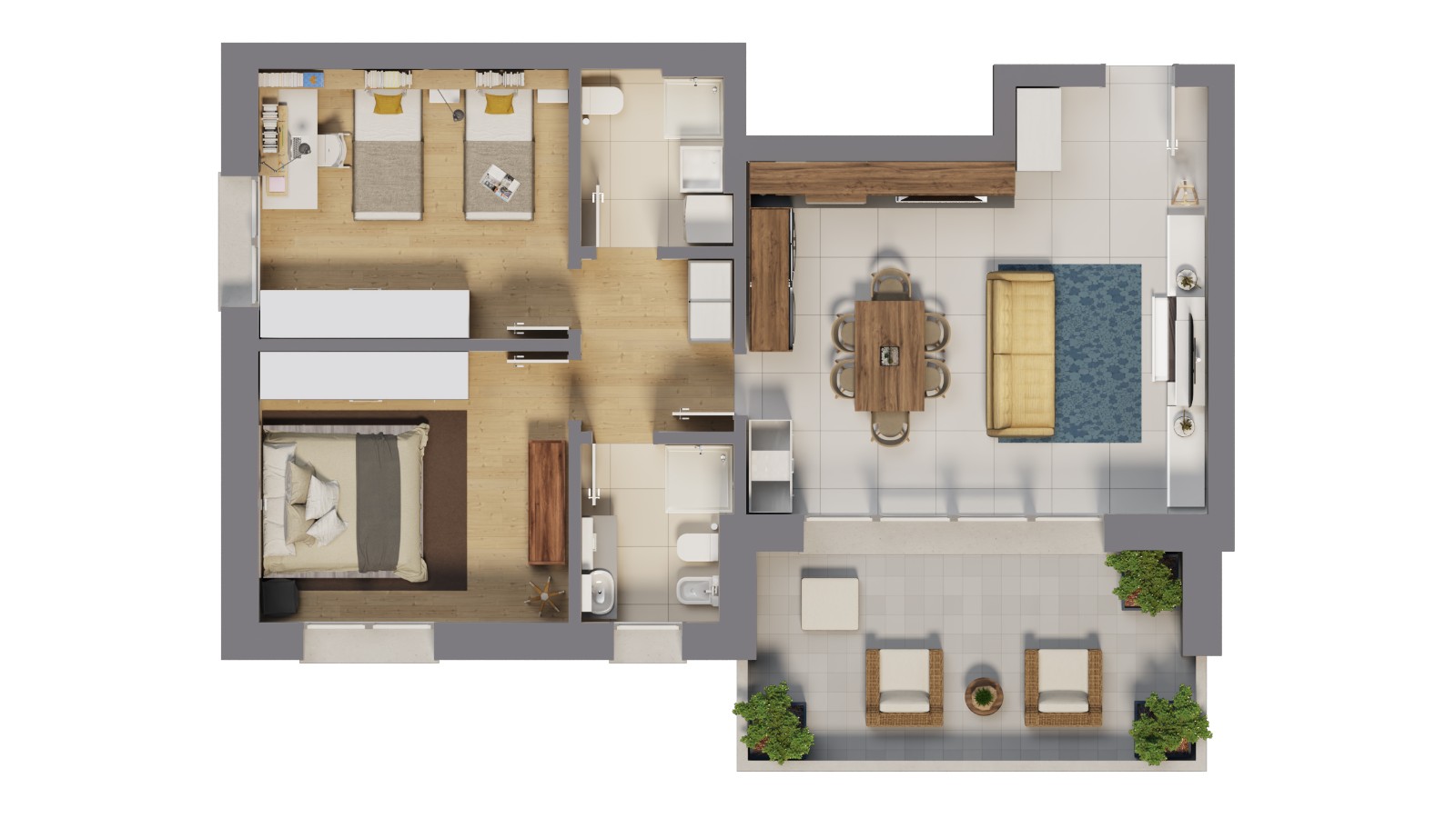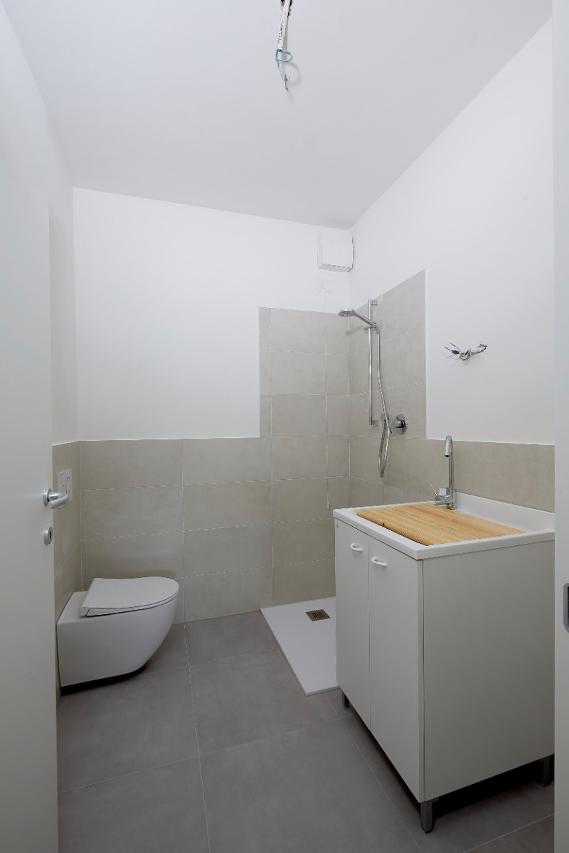 Cucina e soggiorno si fondono in un unico ambiente da vivere affacciato sulla loggia che regala una piacevole e spaziosa zona relax all’aperto. L’unità è dotata di un ampio bagno finestrato mentre la spaziosa lavanderia può fungere da secondo bagno.