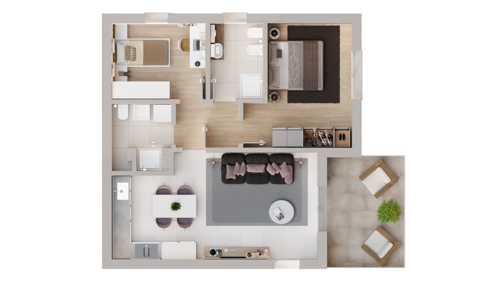 Gli ambienti interni dell’appartamento sono ampi e luminosi, studiati per garantire il massimo comfort abitativo. La zona giorno, concepita come open space, è pensata per essere vissuta appieno, mentre la loggia rappresenta un accogliente spazio esterno dove rilassarsi in ogni momento della giornata.